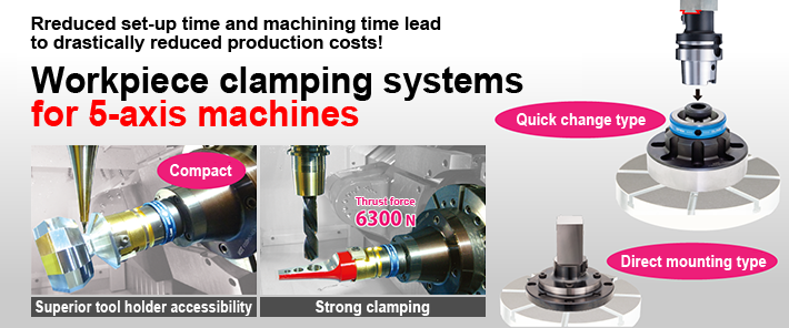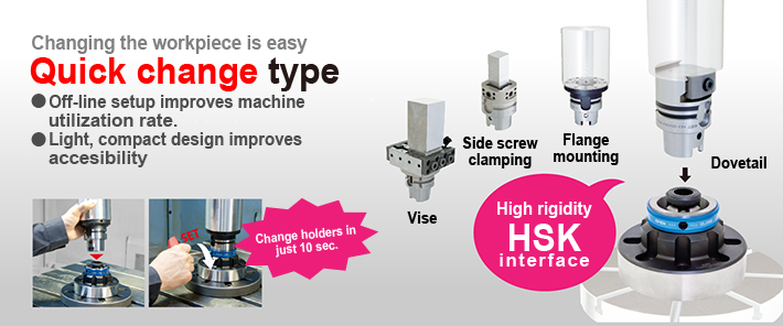 Easy work holder changing using just a wrench. Off-line setup is possible, so you can start the next machining quickly when the workpiece is mounted to the work holder in advance.