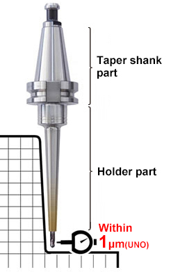 Taper shank parts, which attach to the MC, are made of carbon steel. The cutter clamping portion is made of special steel with higher-than-normal coefficient of thermal expansion. A hybrid holder made of different materials with functions that meet user needs. |
