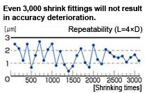 A MST’s special steel for exclusive use in shrink fit holders has a very large coefficient of thermal expansion (1.6 times greater than that of other companies), and it has superior heat resistance. It is an expansive material and achieves low-temperature shrink fitting at 300℃ (430℃ maximum). There is no need to worry about the deformation of the holder materials due to overheating. The stable performance of MST’s special steel can be demonstrated indefinitely in small-diameter holes, in which higher heating temperatures are needed. |