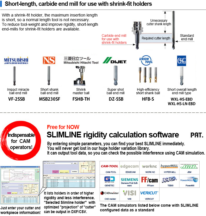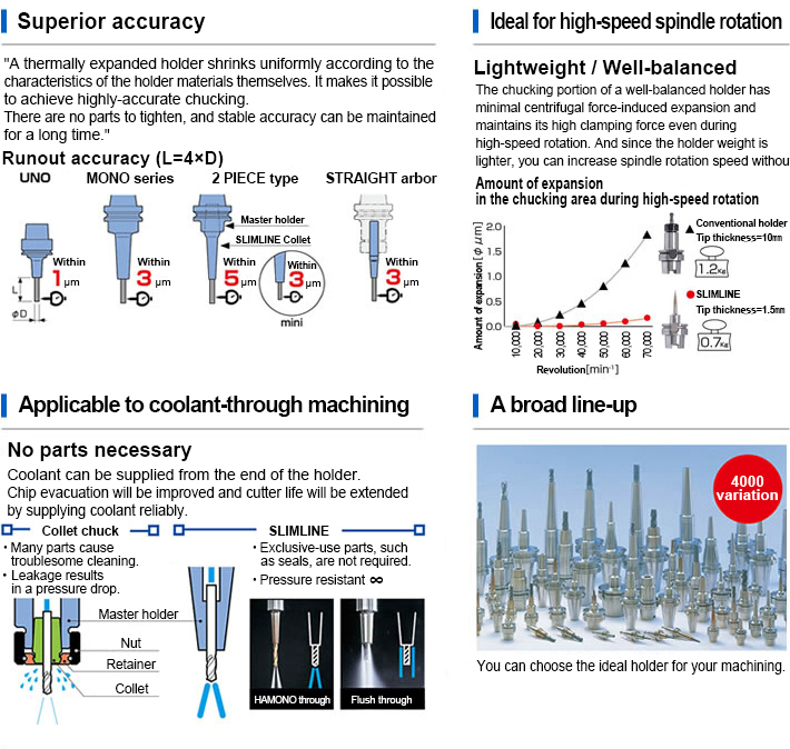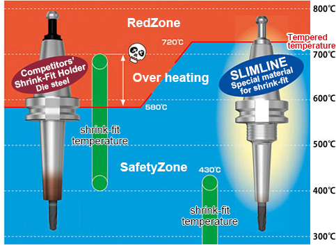 “Low-temperature shrink fitting” is available at 300゚C.SLIMLINE holders provide “high clamping force”, “long life” and “chucking of small-diameter cutting tools”.