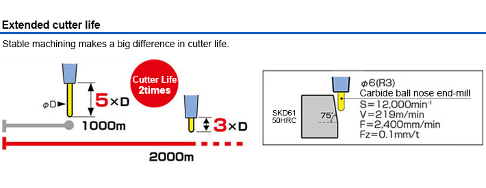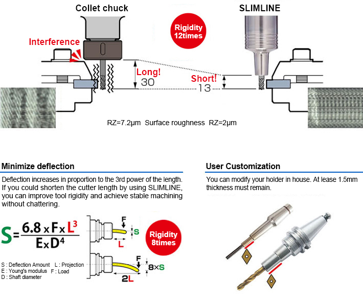 There is no interference with workpieces or jig fixtures. The holder can approach very close to a workpiece. Cutting tool overhang can be set to the shortest length.