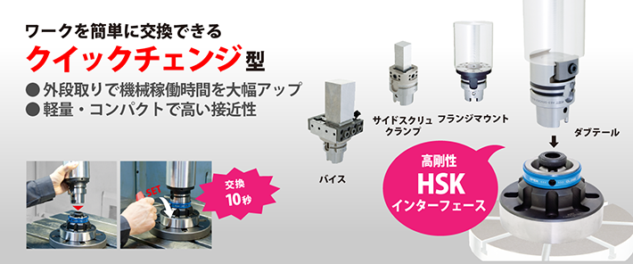 ワークホルダとヘッドをつなぐインターフェース部は、ツールホルダシャンクとして実績のあるISOのHSK-Aタイプを