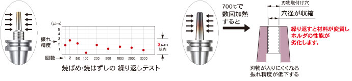 材料の耐熱温度を超えて焼ばめ(オーバーヒーティング)を行います。オーバーヒーティングを繰り返すと材料が変質しホルダが使用できなくなります。