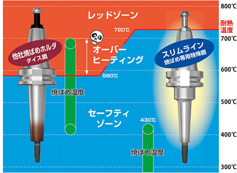 MSTの「焼ばめ専用特殊鋼」は 熱膨張率が非常に大きく他社の 1.6倍あり、耐熱温度にも優れた 材料です。 よく伸びるため300℃(Max.430℃)の 低温焼ばめを実現。 より加熱温度が必要な小径孔も オーバーヒーティングによるホルダ 材料の変形の心配がなく、安定した 性能をいつまでも発揮できます。 |
