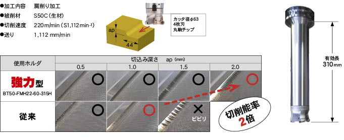 FMH強力型を使い分けることで、高切り込み、高送りが行なえます。